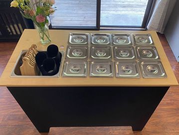 Comes with 12 - 1/6 size stainless steel pans + lids; You fill with your goodies!
